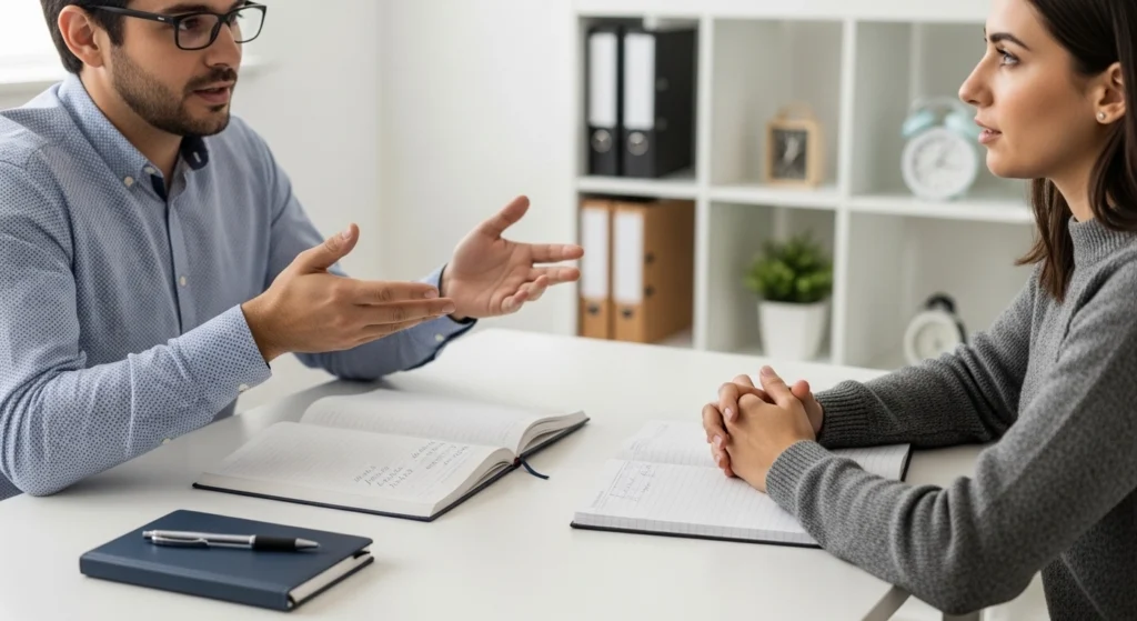 A imagem mostra um momento de orientação, em que alguém busca ajuda para organizar decisões financeiras com mais clareza. A cena transmite diálogo e troca, sem hierarquia ou pressão, reforçando que chamar um profissional faz sentido quando a situação pede apoio técnico e visão externa. O ambiente simples e acolhedor sugere que esse tipo de ajuda não precisa ser distante nem sofisticada, apenas adequada ao momento e à necessidade real de quem procura.