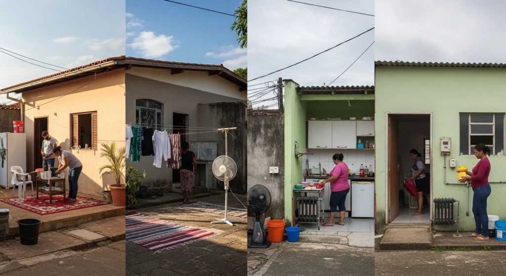 A imagem ilustra como a rotina doméstica muda conforme o tipo de moradia, a região e os hábitos de consumo. O espaço disponível, o clima e a forma de medir gastos influenciam diretamente o ritmo das tarefas e a sensação de correria. Cada cenário mostra que não existe uma solução única: o que funciona em uma casa pode não funcionar em um apartamento, e ajustes simples variam conforme contexto e realidade local.