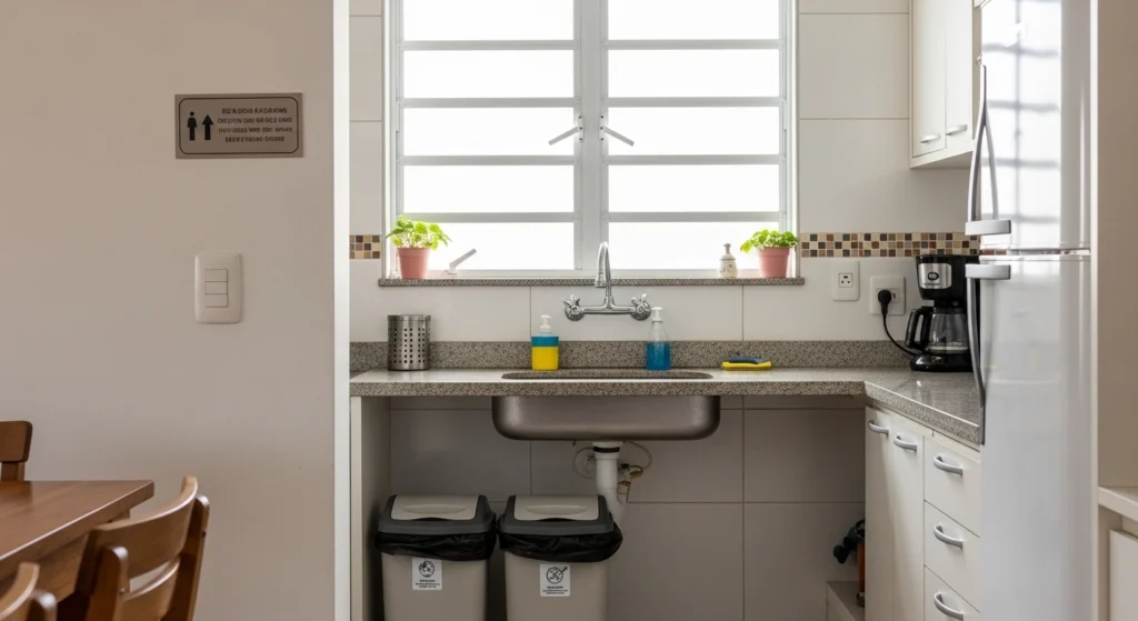 Você pode colocar um aviso discreto na cozinha e, se necessário, explicar em uma frase onde fica o descarte do prédio. Se houver horários, diga só o essencial para não virar texto longo.