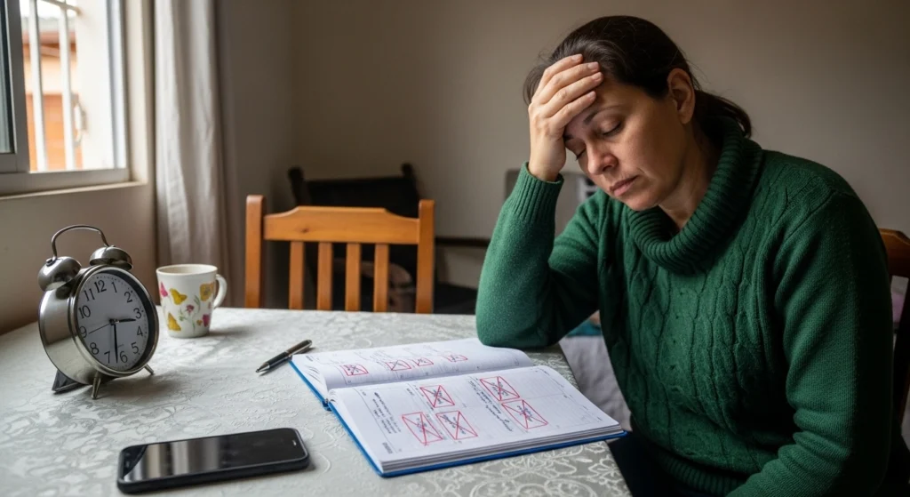 A imagem retrata o momento em que a tentativa de controlar cada detalhe do dia se transforma em desgaste. A agenda cheia e as notificações acumuladas simbolizam uma rotina rígida demais para a vida real, enquanto os pequenos sinais de desordem ao redor lembram que o cotidiano não obedece a planejamentos perfeitos. A cena transmite a ideia de que rotina não deveria ser sinônimo de vigilância constante, mas de apoio para viver com menos atrito.