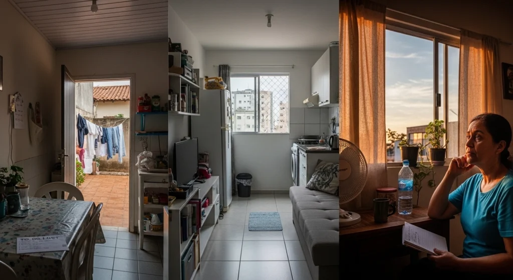 A imagem mostra que a rotina muda conforme o contexto: morar em casa ou em apartamento, viver em regiões diferentes e lidar com estruturas distintas altera completamente o jeito de organizar o dia. Os ambientes lado a lado reforçam que não existe um modelo único de rotina, e que medir o que funciona precisa considerar espaço, clima, barulho, deslocamento e energia disponível. A cena traduz a ideia de adaptação prática, não de comparação ou padrão ideal.