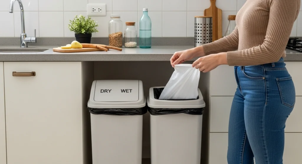 A separação quebra quando exige “muita força de vontade”. Para evitar isso, reduza fricção: deixe o seco e o úmido em locais óbvios, com sacos fáceis de trocar, e sem depender de “lembrar depois”.