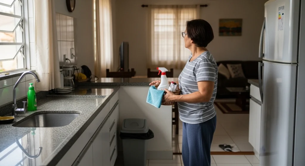 Outro erro é usar o mesmo pano para tudo. Isso espalha gordura da cozinha no resto e dá sensação de “sujeira que volta”. Separar por área já reduz retrabalho.