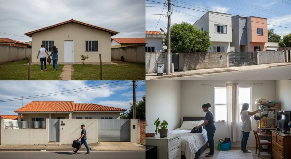 A imagem ilustra como organização e convivência mudam conforme o tipo de moradia, a região e a rotina das pessoas. Casas e apartamentos apresentam desafios diferentes, assim como climas mais úmidos ou mais quentes influenciam hábitos diários. As cenas mostram que não existe um único padrão ideal, mas adaptações práticas ao contexto real de cada lar.