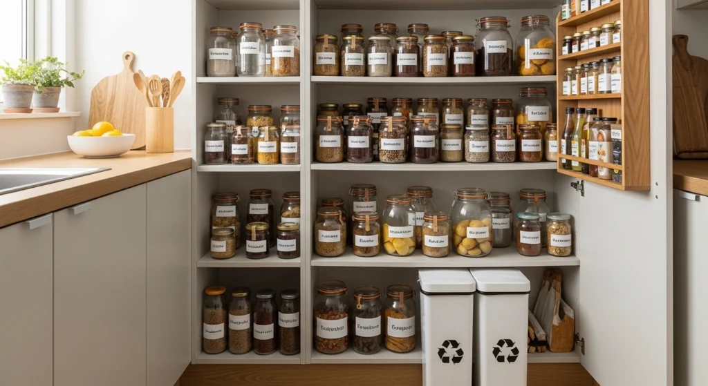 A imagem representa a prevenção do acúmulo por meio de limites claros e organização simples. Poucos recipientes, bem escolhidos e fáceis de acessar, mostram como a manutenção evita que o armário volte a virar um depósito. O cenário reforça a ideia de reaproveitar com intenção, não por impulso, mantendo a casa funcional ao longo do tempo.